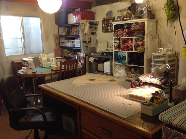 My Dream Sewing Room 2014… unfinished and located in the basement, but filled with maximum creative juice for a fraction of the price (courtesy of tag sales, Habitat for Humanity, and area thrift stores). Even the machines are all second hand.