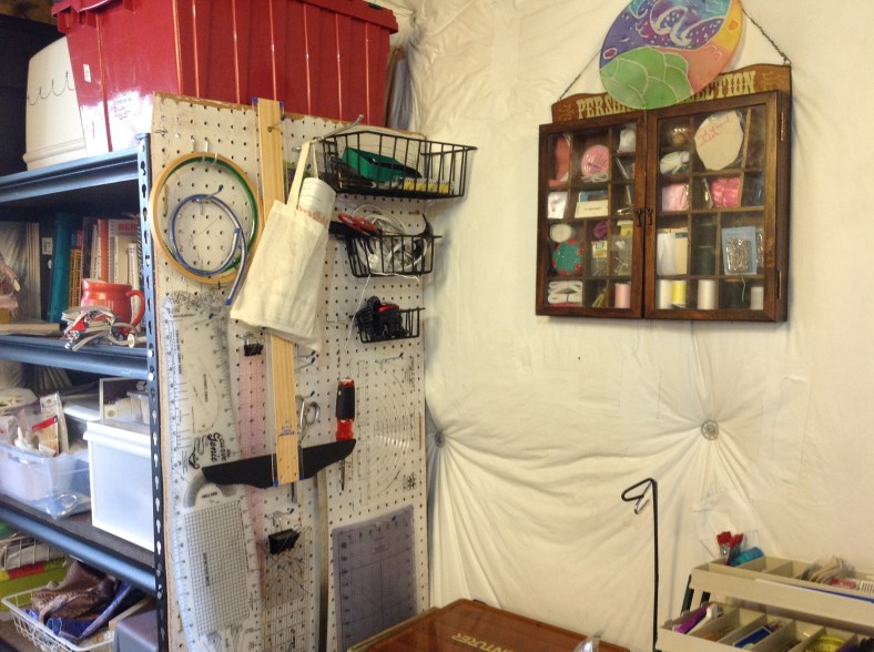 My Creole Grandmother’s embroidery and sewing notions kept in a curio cabinet for perpetual inspiration.