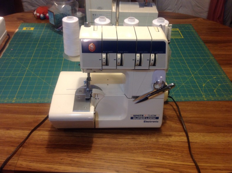White Superlock 734 DW Serger. Purchased for $150 with the advice that parts couldn’t be found once they wore out. Not so! In the age of the Internet, finding blades and parts has not been a problem at all… this ended up being a fantastic purchase. I use it with each project.
