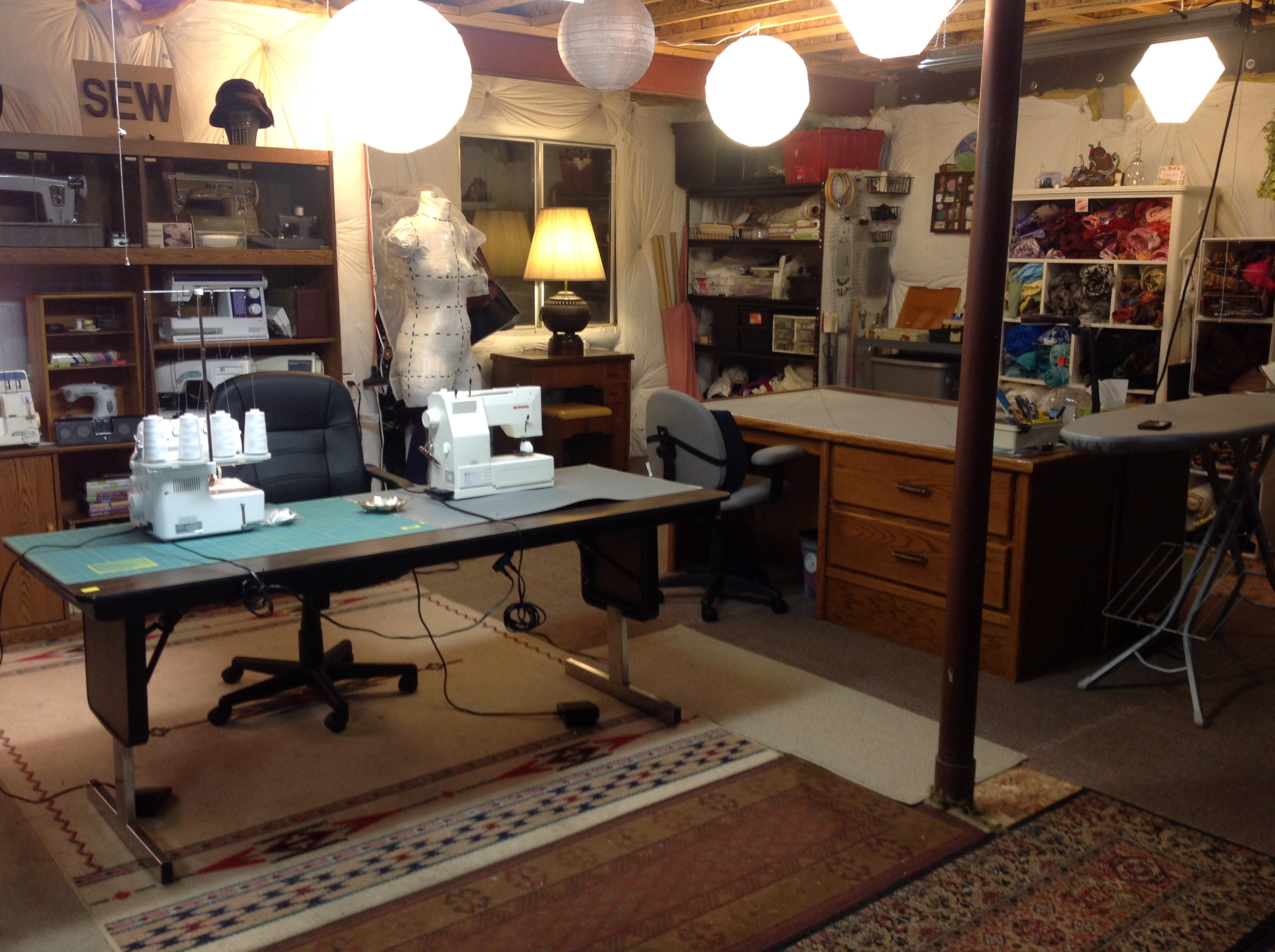 My unfinished, bargained, basement sewing room. Nothing matches, and everything is second-hand with the exception of one machine. It may not be fancy, but I love it. Yes, that is a self-made, duct tape dress form on a PVC pipe stand (supplies $25). Wonderfully customized and easily updated as life archives itself on in my maturing body!