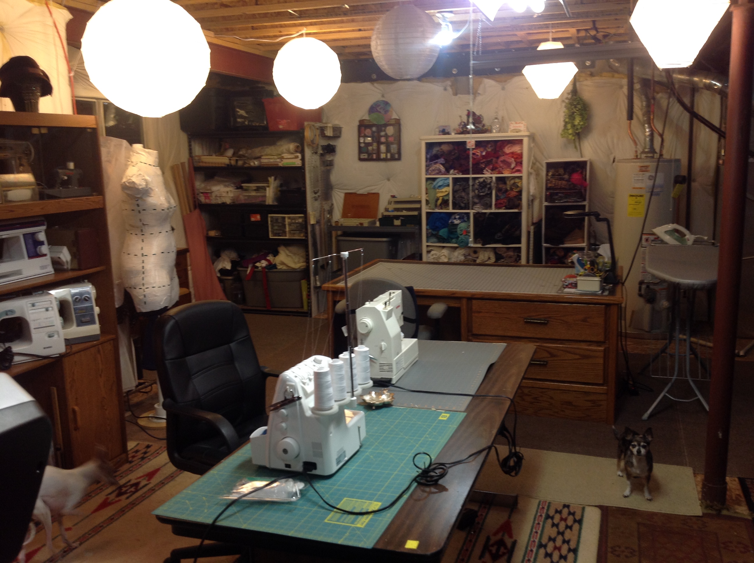 A variety of light sources, florescents, natural light from two windows, LED lights, vintage lamps, illuminated magnifiers… providing me the ability to change the light for whatever work is needed. Yep, that’s a home-made duct tape dress form on PVC piping that was only $28 to build.