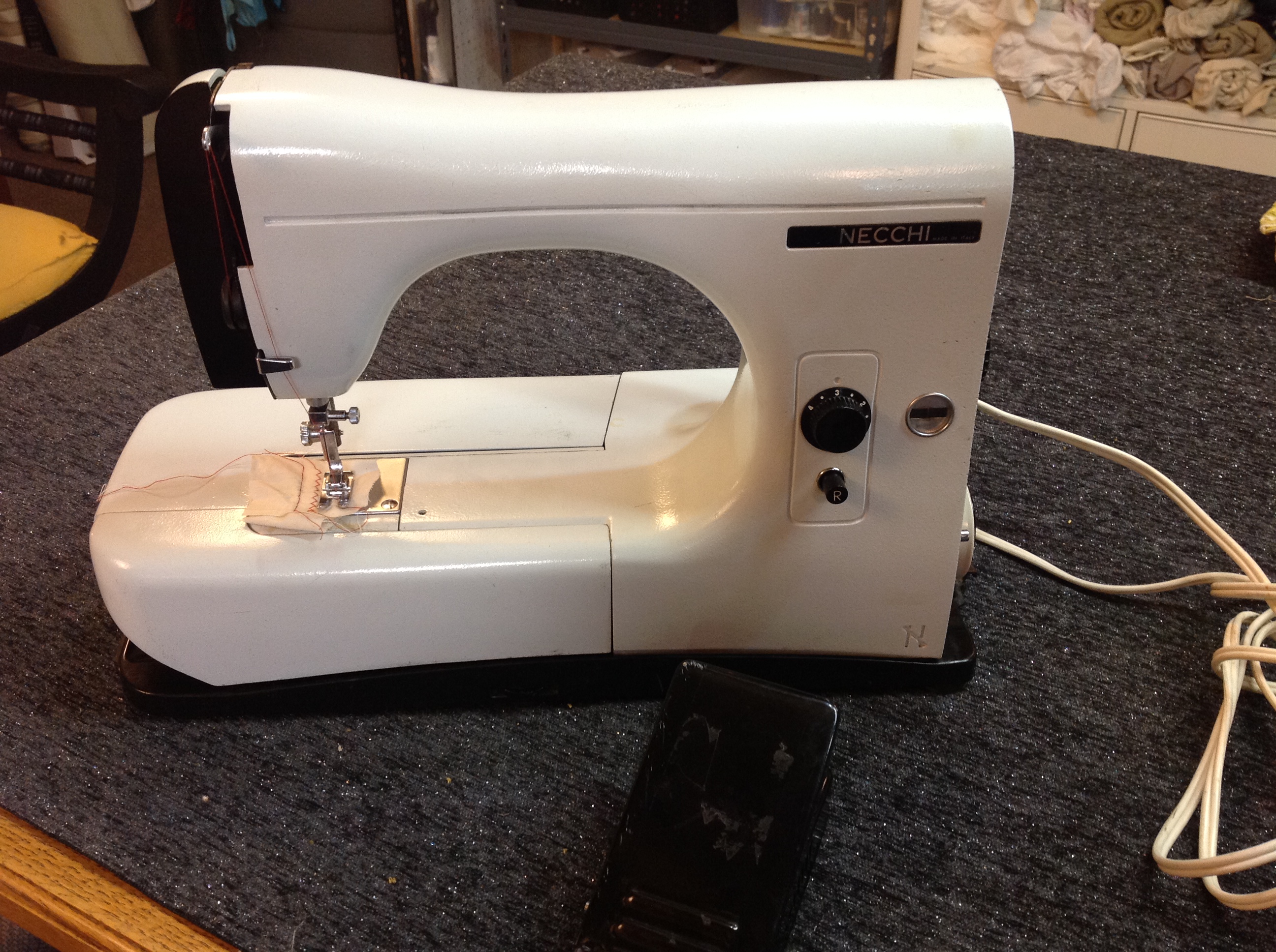 Necchi Lydia 3, Model 544 (made in Italy, 1960’s)). $70. Many bloggers have a love/hate relationship with this machine and I witness frequent cursing over it! This model has all presser feet, a working foot pedal, and a few original bobbins (very hard to find). However, I had to research an online version of the manual, and could only find a version for another 544 generation. If any enthusiasts out there are willing to share a copy I would be most grateful. The bobbin winder is broken, and I’m planning to repair it. Like most sewing geeks, the sleek design mesmerized me and I went on a mission to locate one for my collection. The machine has a reputation for the internal cams cracking, because Necchi devolved to plastic for this integral and crucial piece. It turned out to be the lynchpin instigating the demise of the company. But many Italian tailors have created couture fasion art and pristine suits on these beautiful machines.