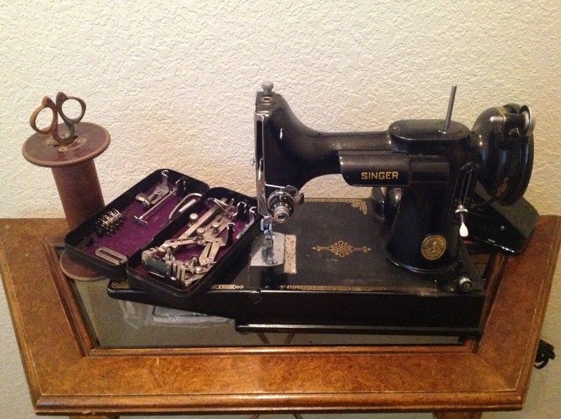 The classic and coveted Singer Featherweight 221! Fortunately this is a working model with all pieces. Featherweights were famous for their full-sized motor supporting half-sized mechanics… ideal for portable use by industrial age households.