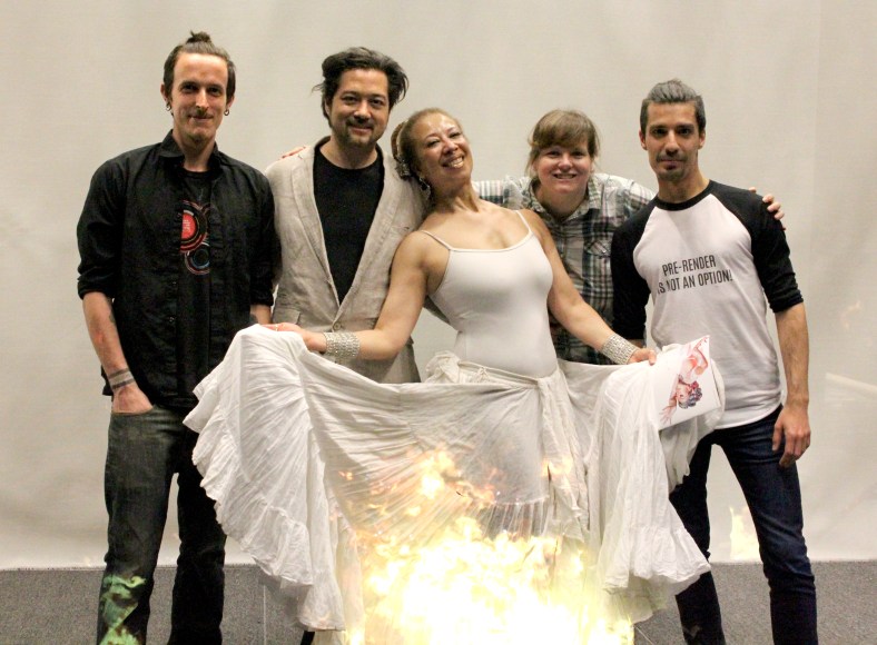 The collaborative team of “Origin Stories, 2016,” Produced and conceived by Film maker and composer Kenji Williams. Pictured left to right: Zaak Kerstetter (Music Remix), Kenji Williams (producer, composer), Donna Mejia (Dance Artist), Joanna Bugajska (production assistant), Gordy Chernyyi (Coder and visual artist–the talented man who created the fire projection on my skirt!)