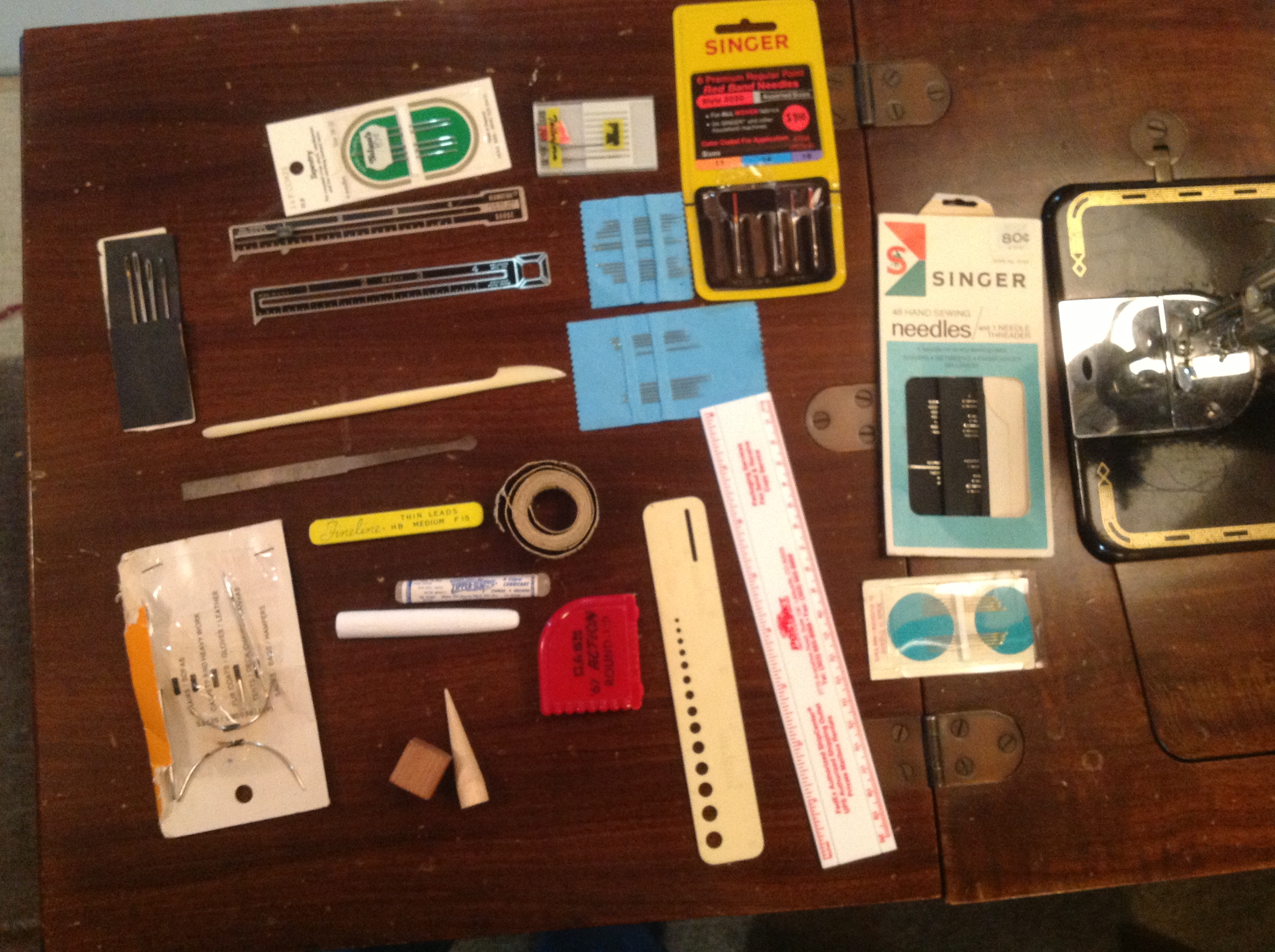 All the magical accoutrements of fine sewing: seam guages, awls, hand needles, tape measure, chalk, etc.